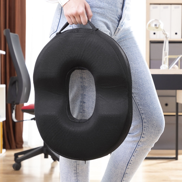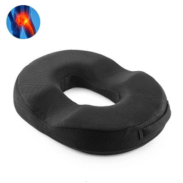 Le coussin Posturea libère la pression sur le nerf sciatique grâce à sa découpe en U et sa mousse à mémoire de forme. Confort, posture et soulagement immédiat — au bureau, en voiture ou à la maison.